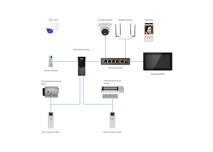 Поддержка 9 вызывных панелей, 8 видеокамер, 9 видеодомофонов, 8 датчиков